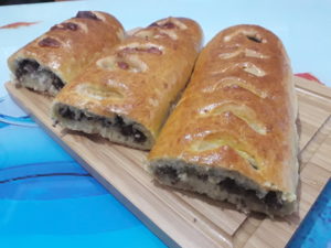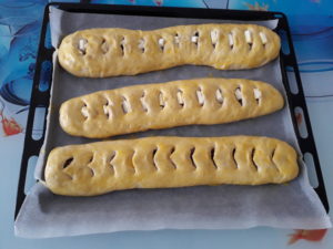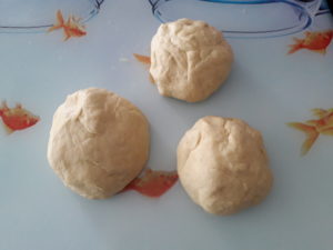 3 parçaya (isteğe göre 4 de olur) bölüp her bir parçayı merdane ile uzunlamasına açıyoruz.