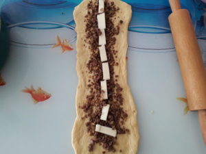 İçine iç harcımızdan koyuyoruz. Küçük dilimlenmiş kaşarlarımızdan da koyup  kenarlardan iyice açılmayacak şekilde kapatıyoruz.